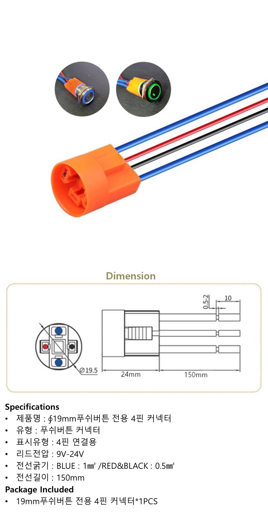 19mm 푸쉬버튼 전용 4핀 커넥터 접속 플러그인