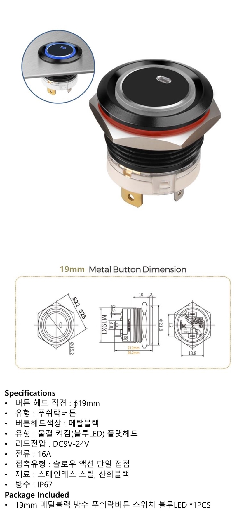19mm 메탈블랙 방수 푸쉬락버튼 스위치 블루LED 9-24V
