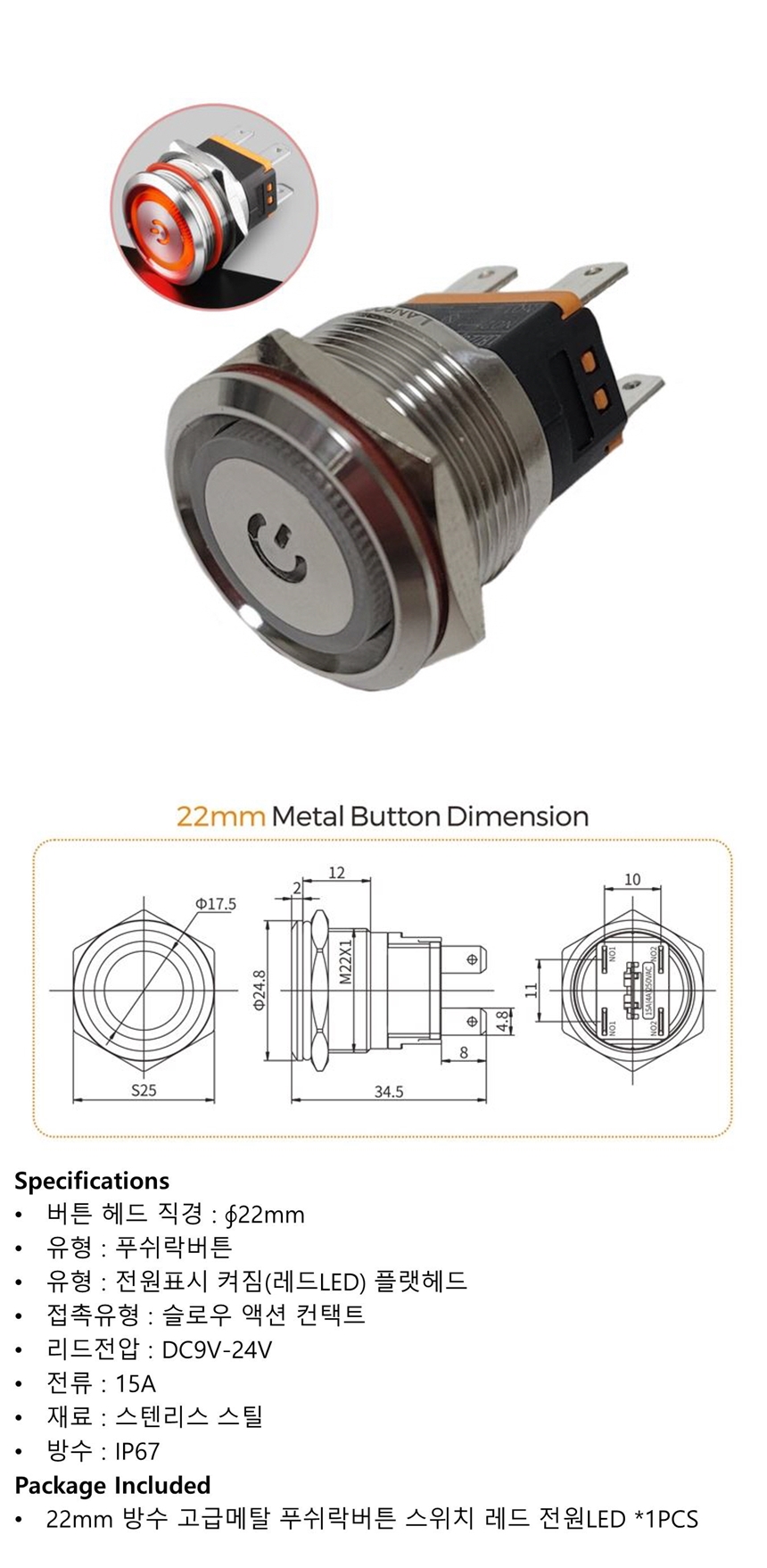 12V 22mm 방수 푸쉬락 버튼 스위치 레드LED 전원표시