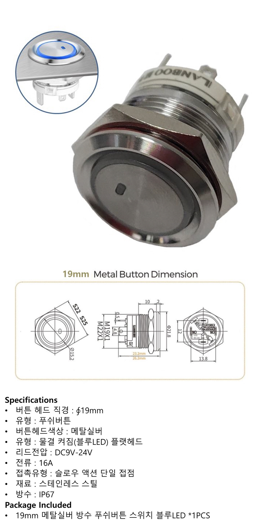 19mm 메탈실버-방수 푸쉬버튼 스위치 블루LED 9-24V