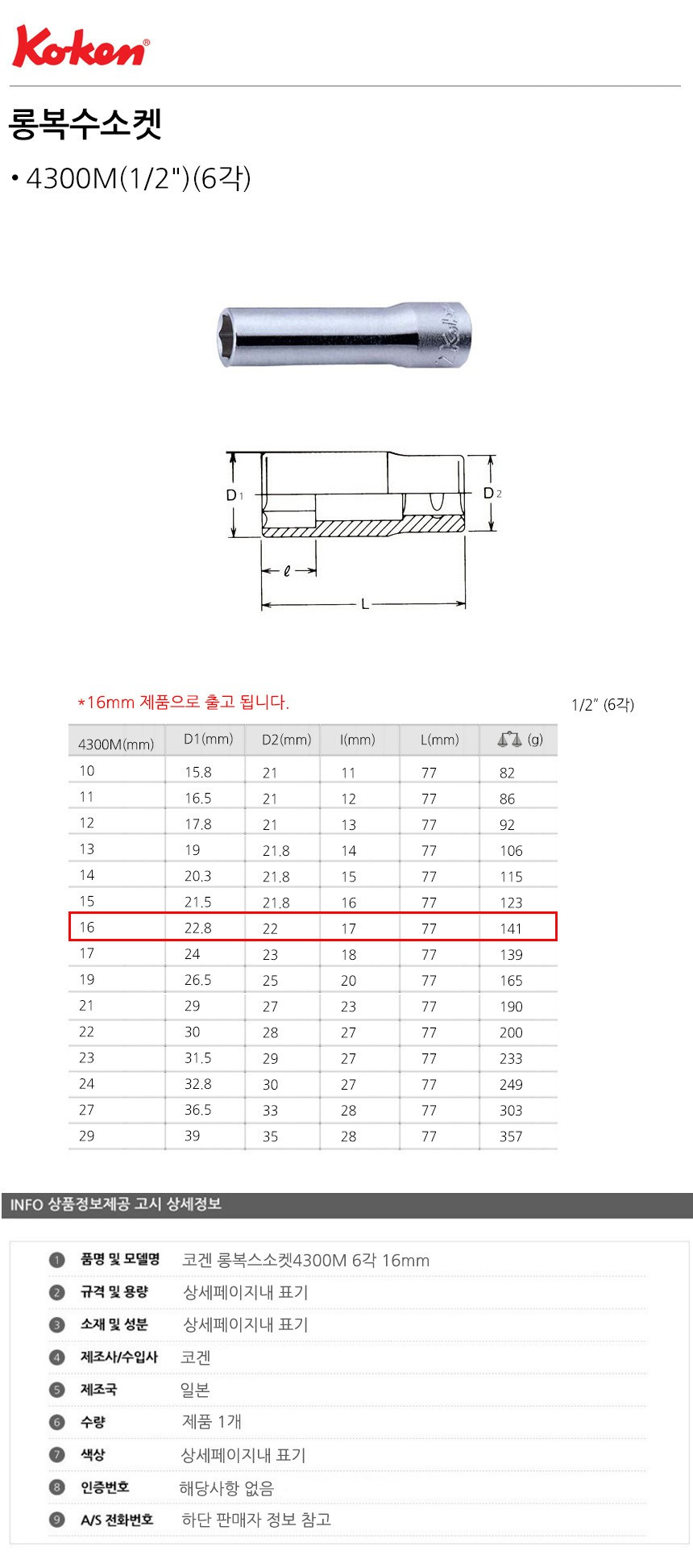 코겐 롱복스소켓4300M 6각 16mm 이미지/