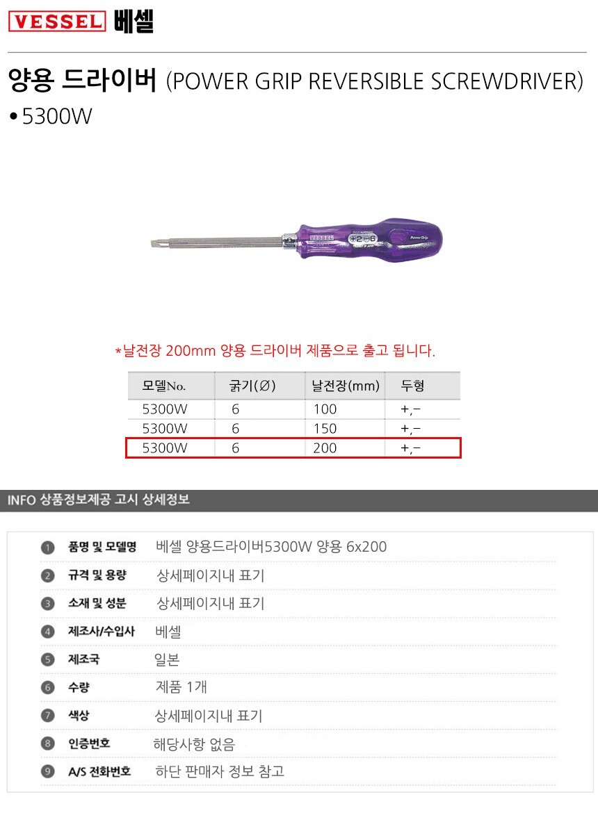 베셀 양용드라이버5300W 양용 6x200 공구 수공구 수작업공구 수작업 작업공구