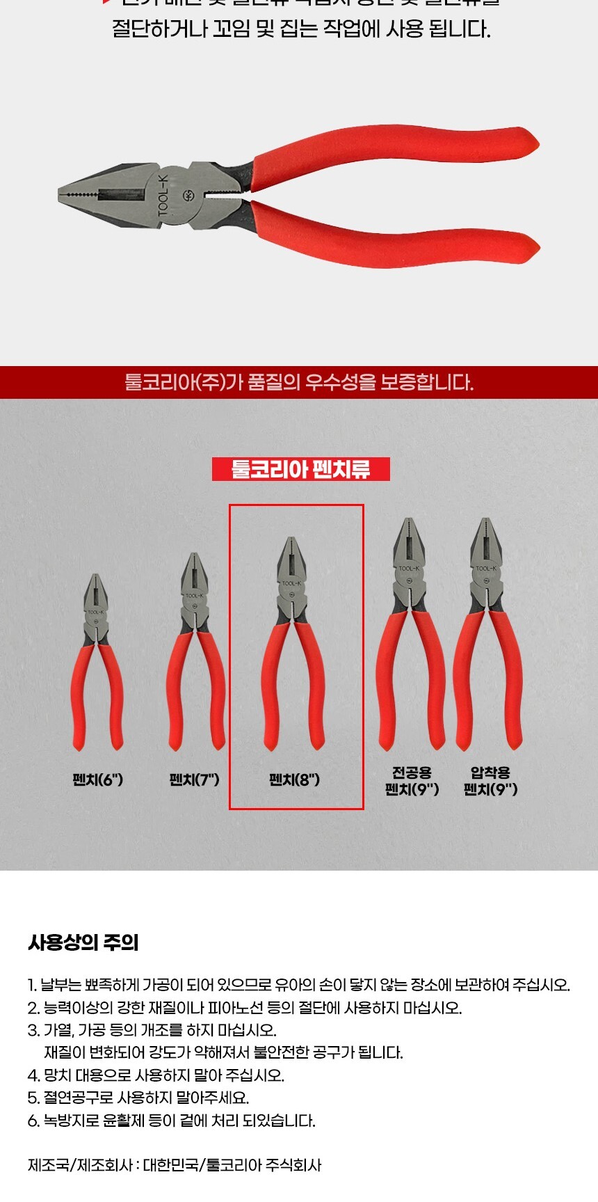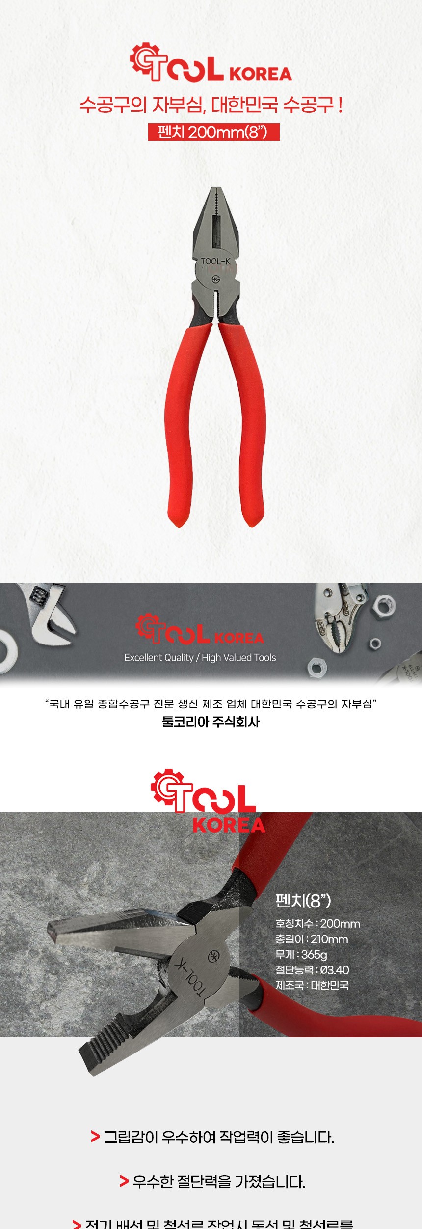 툴코리아 펜치 200mm 작업공구 니퍼 전기작업 전선작업 수공구