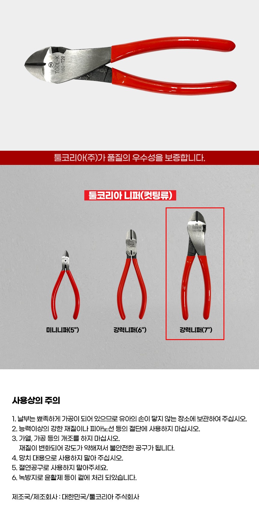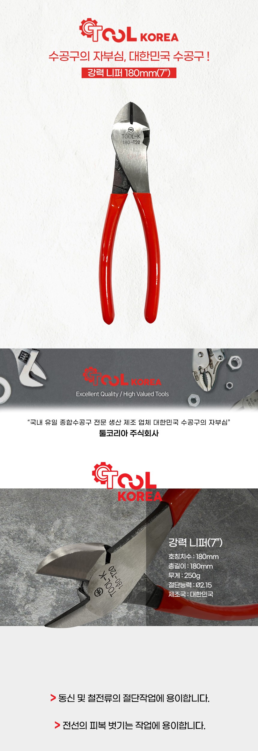 툴코리아 강력 니퍼 180mm 니빠 작업공구 전기작업 전선작업 수공구