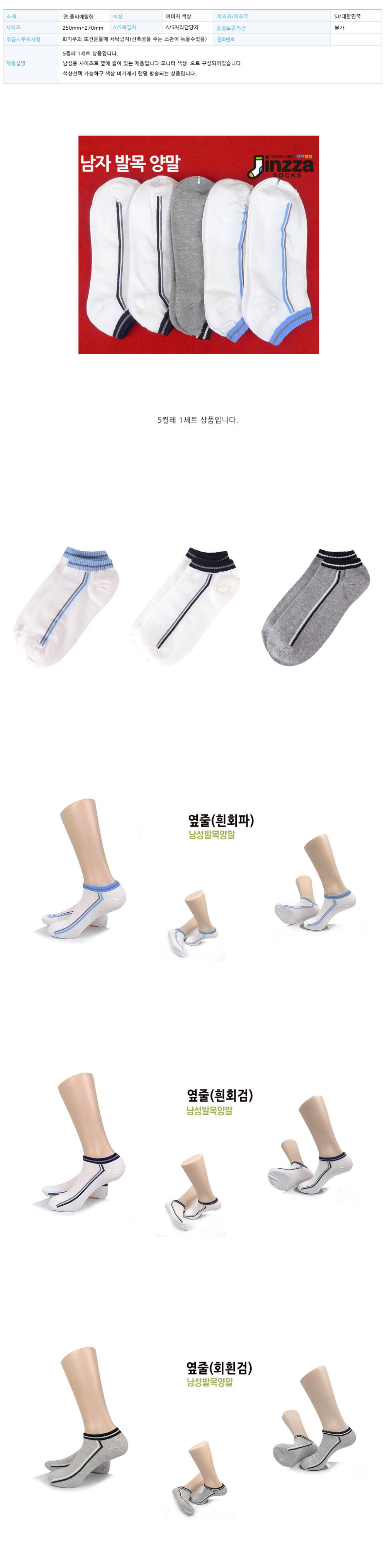 국산 남성 캐주얼 발목양말(옆라인) 5켤레 묶음 이미지/