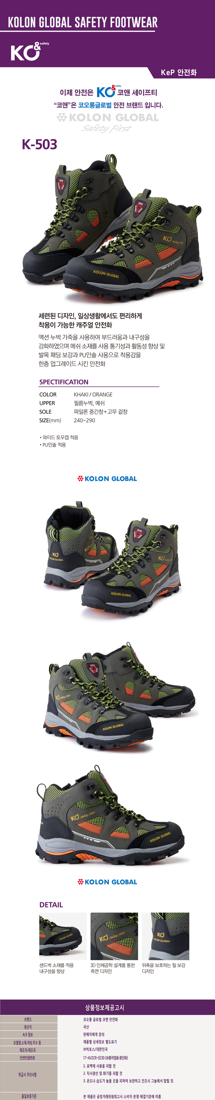 코오롱글로벌 안전화 K-503 6인치 작업화 코오롱글로벌 K-503 (6인치) 240mm