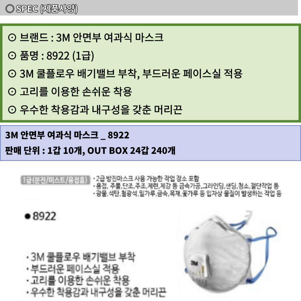 3M 분진 미스트 1급 안면부 여과식 방진 마스크 8922
