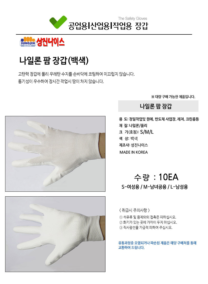 성진 나일론팜 손바닥 코팅 장갑 흰색 10개 이미지/