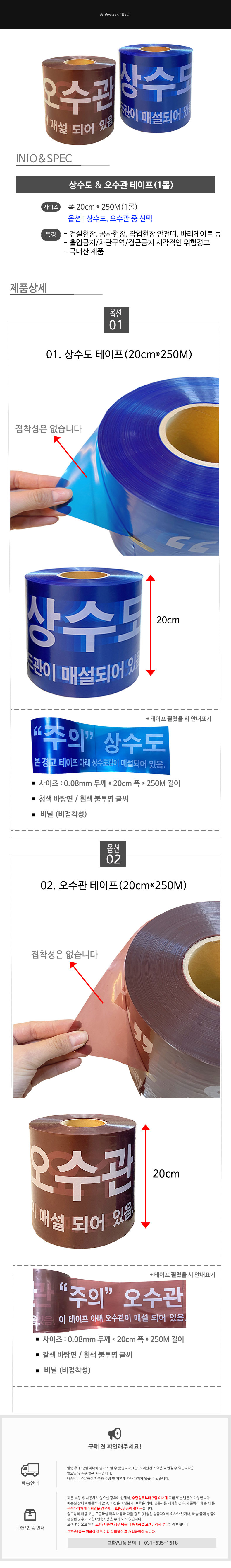 상수도테이프 오수관테이프 토목공사 안전띠 주의 경고테이프 20cm x 250m 1롤