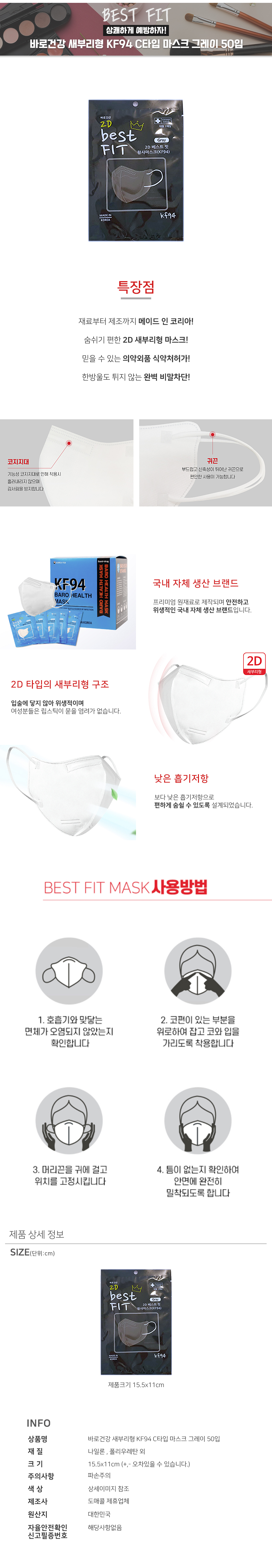 모델명 바로건강 새부리형 KF94 C타입 마스크 그레이 50입