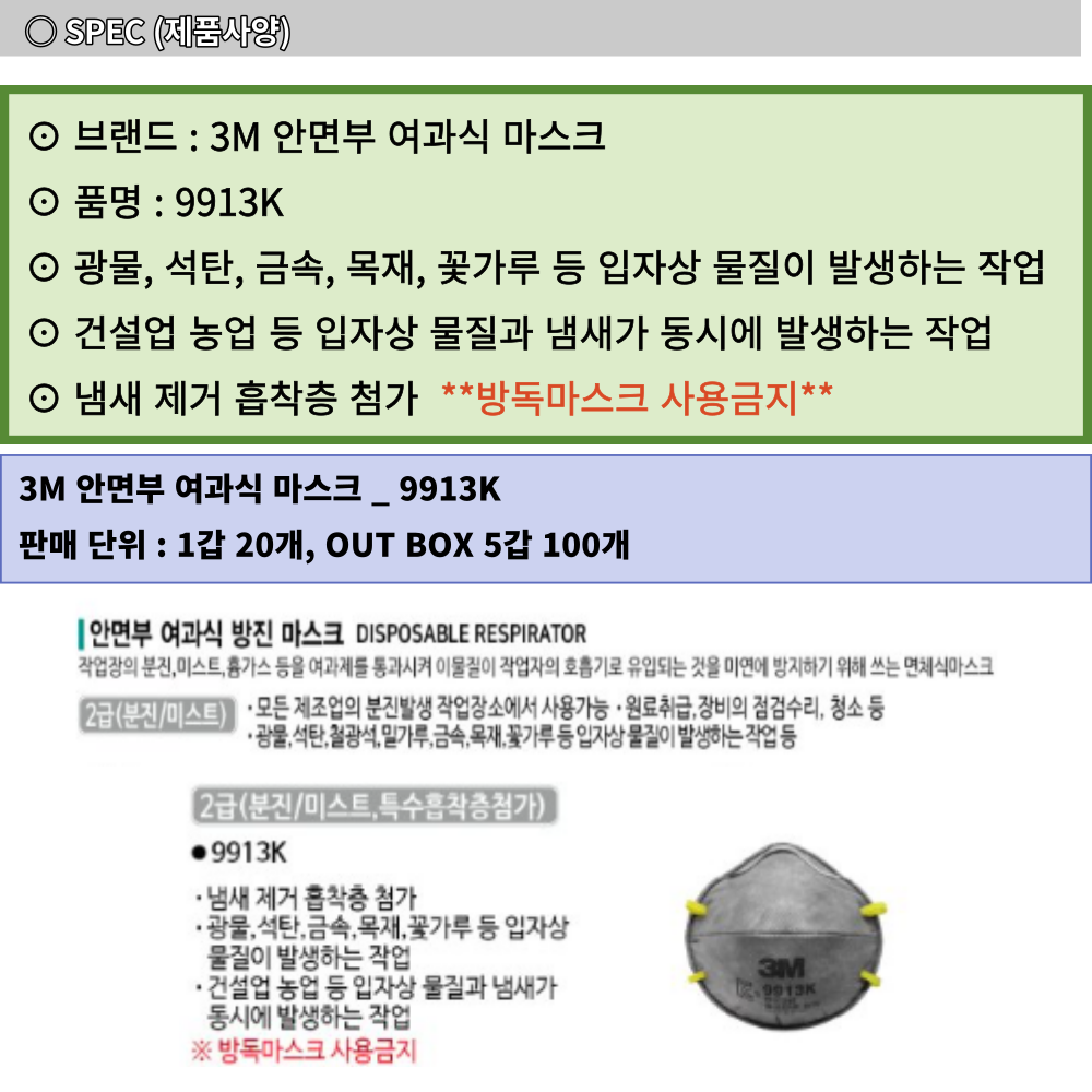 3M 분진 미스트 2급 안면부 여과식 마스크 9913K