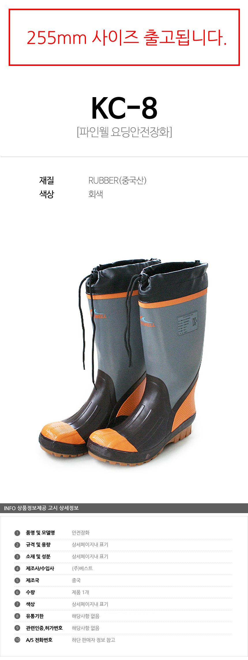 파인웰 요딩안전장화 KC-8-작업화 255mm 안전화 안전신발 보호구 안전용품 보호용품