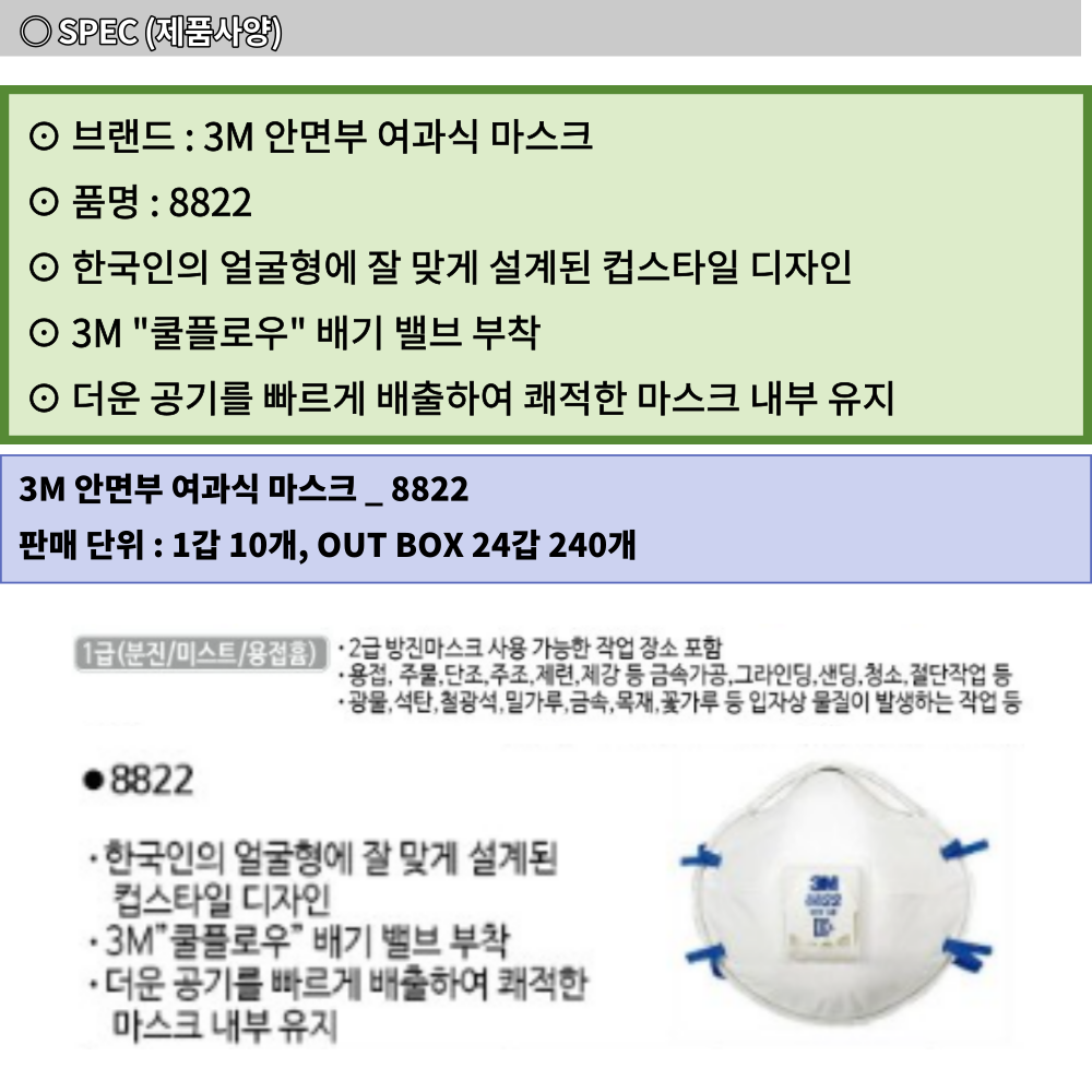 3M 분진 미스트 1급 안면부 여과식 방진 마스크 8822