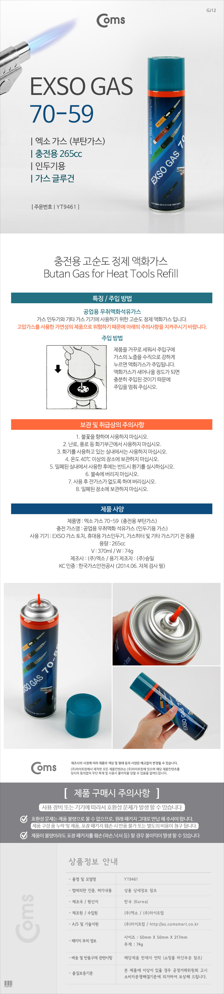 Coms 엑소 가스(GAS) 부탄가스 70-59 충전용 265cc 인두기용/가스글루건 이미지/