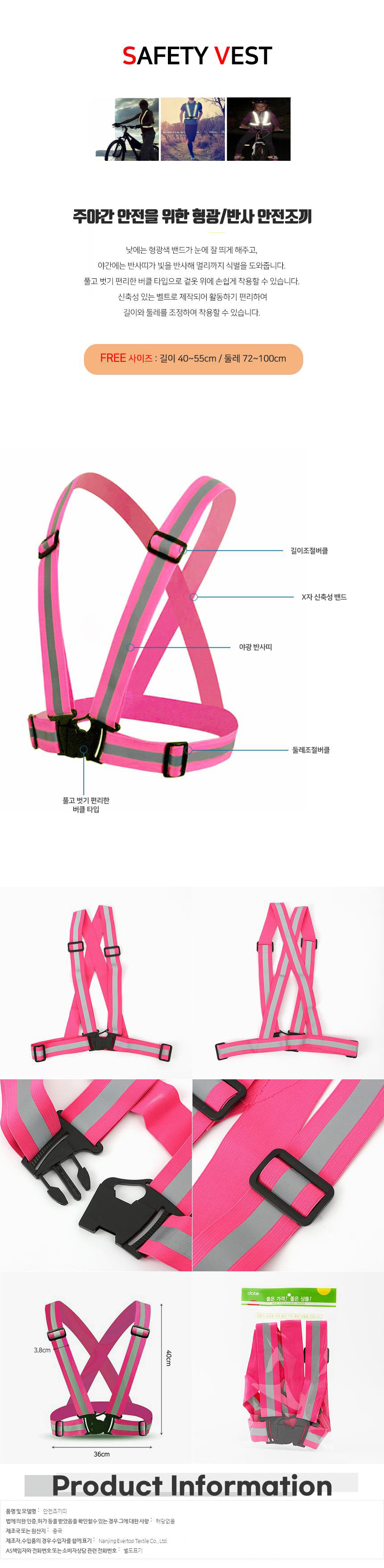 버클타입 야광 반사 안전조끼띠 핑크x3개 작업용