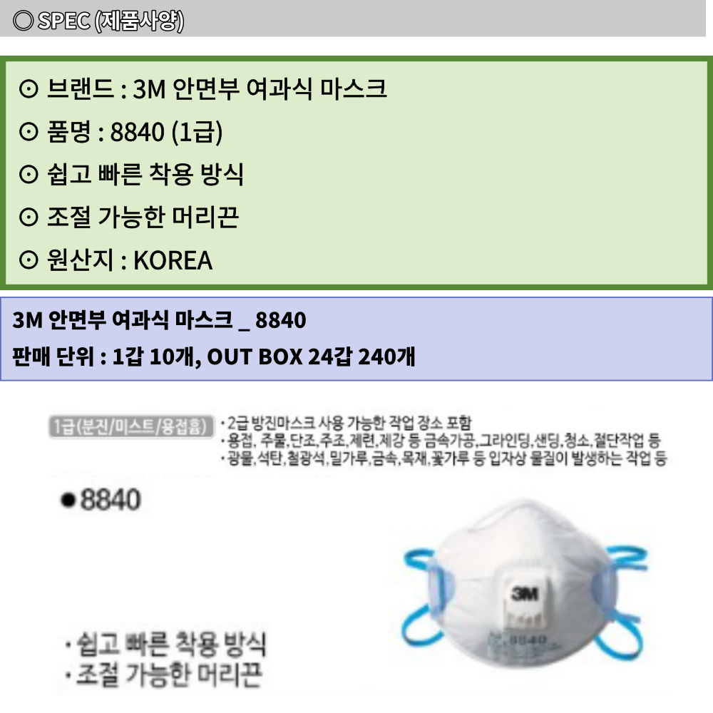 3M 분진 미스트 1급 안면부 여과식 방진 마스크 8840