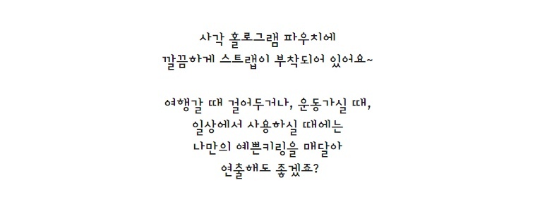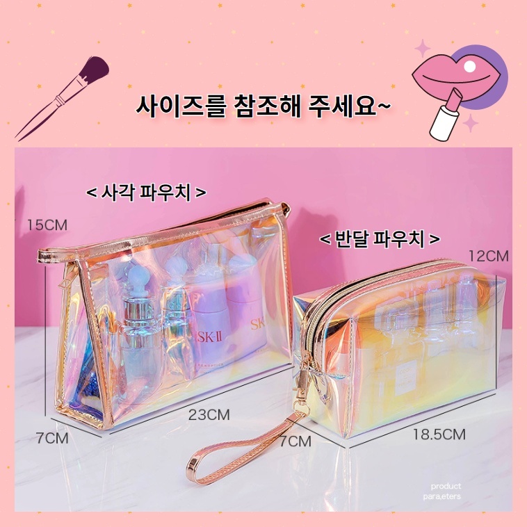 4. 크기 : 홀로그램 반달 파우치 (가로18.5cm / 세로7cm / 높이12cm) , 홀로그램 사각 파우치 (가로23cm / 세로7cm / 높이15cm)