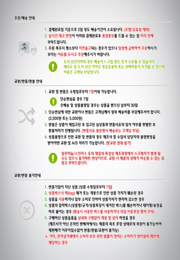 7. 재화 등의 교환/반품/보증과 그 대금 환불 및 환불의 지연에 따른 배상급 지급의 조건/절차 : 상세정보 별도표기