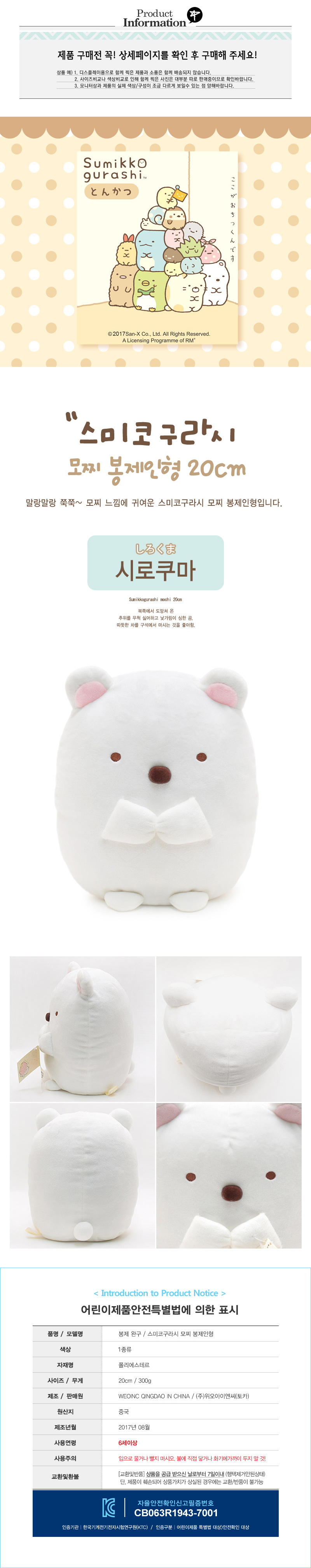 기념일 이벤트 팬시 스미코구라시 시로쿠마 캐릭터 봉제 인형 20cm 이미지/
