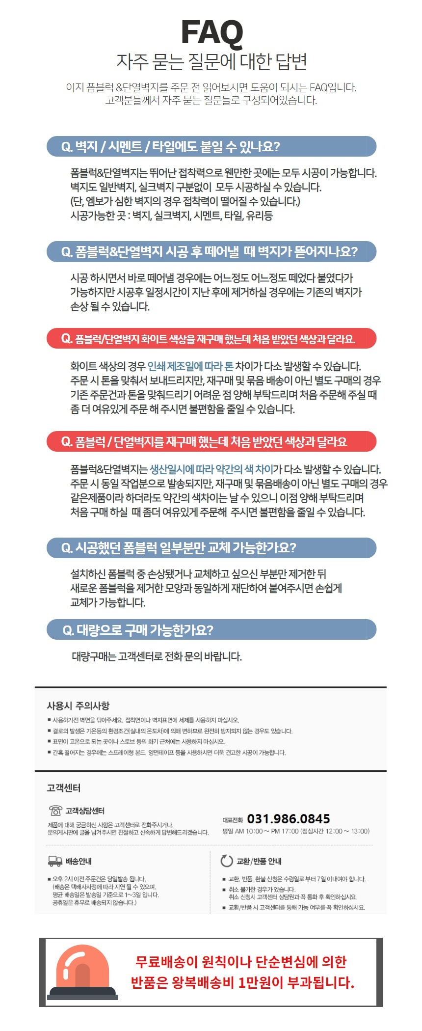• 초기제품 이상의 경우 동일한 제품으로 1:1 교환원칙, 사용후 제품이상은 A/S를 원칙으로 합니다.