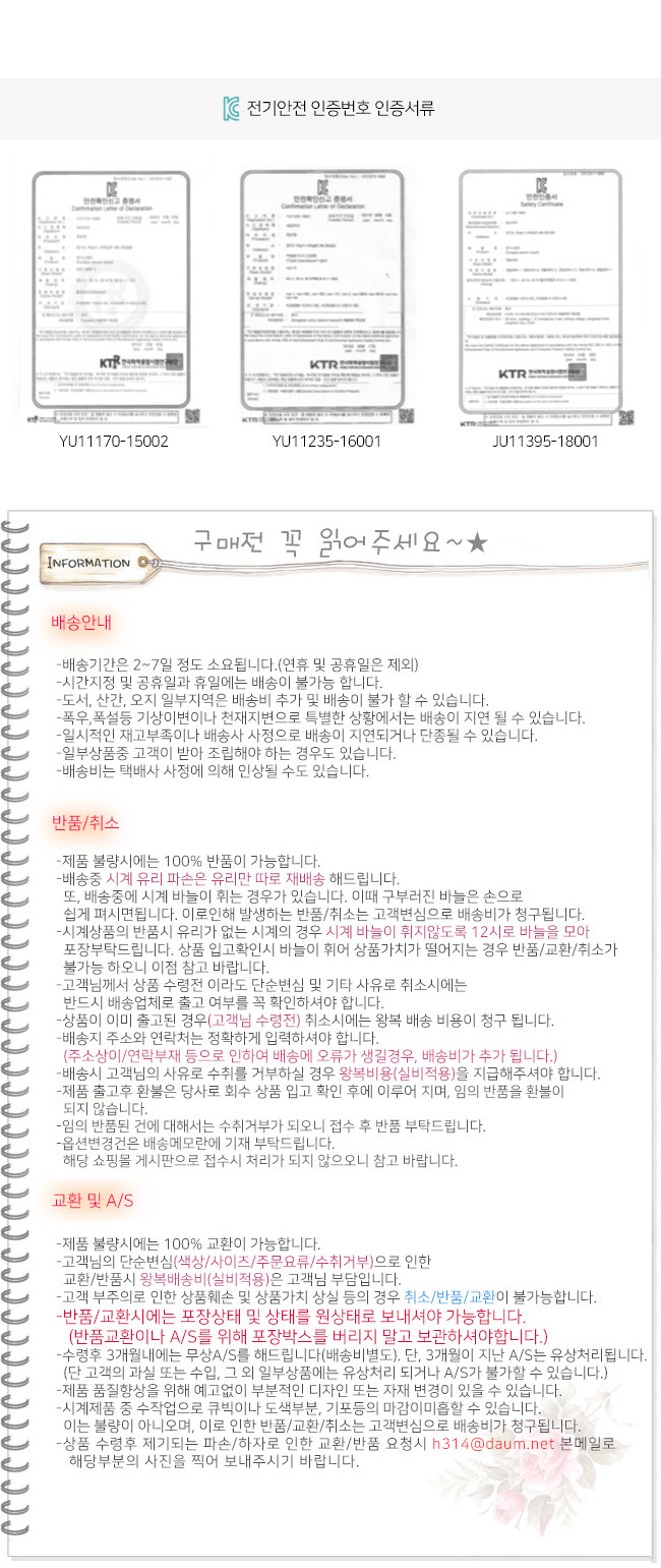 • 초기제품 이상의 경우 동일한 제품으로 1:1 교환원칙, 사용후 제품이상은 A/S를 원칙으로 합니다.