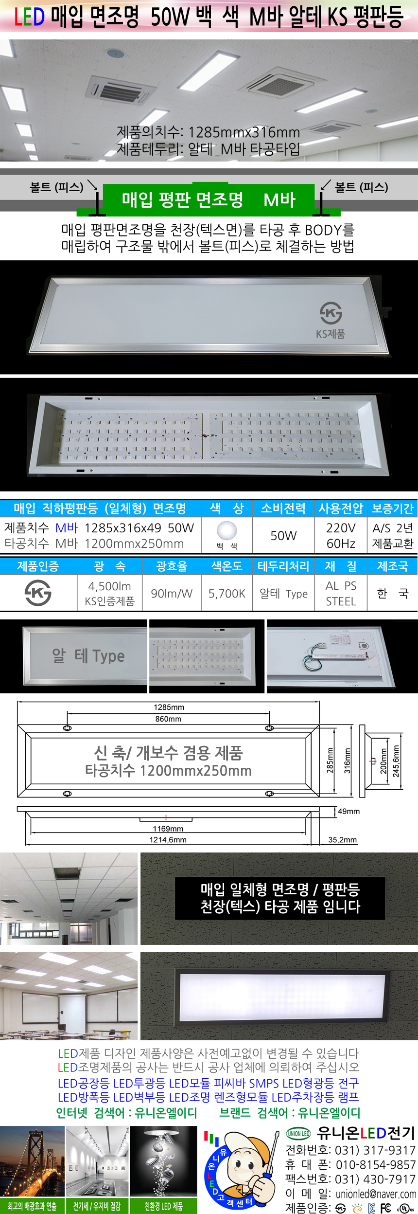 평판등 면조명 M바 알테 50W 백색 1285mm KS 매입등