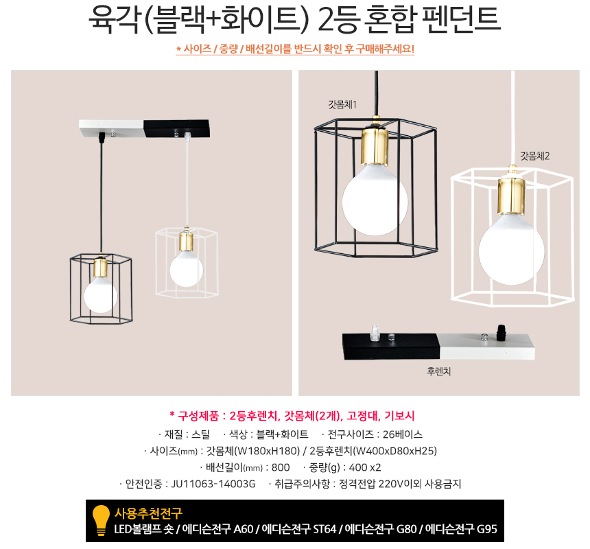 육각블랙화이트 2등 혼합 펜던트/식탁등/인테리어조명/펜던트조명/조명/주방등/예쁜조명 이미지/