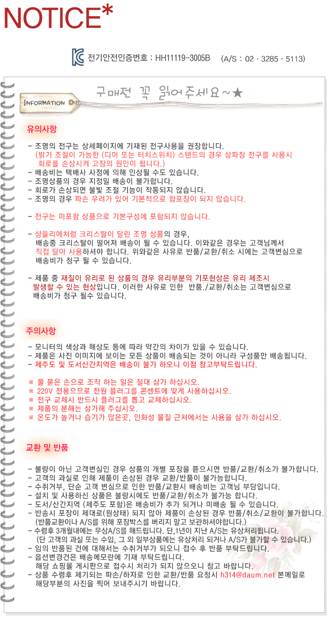 • 초기제품 이상의 경우 동일한 제품으로 1:1 교환원칙, 사용후 제품이상은 A/S를 원칙으로 합니다.