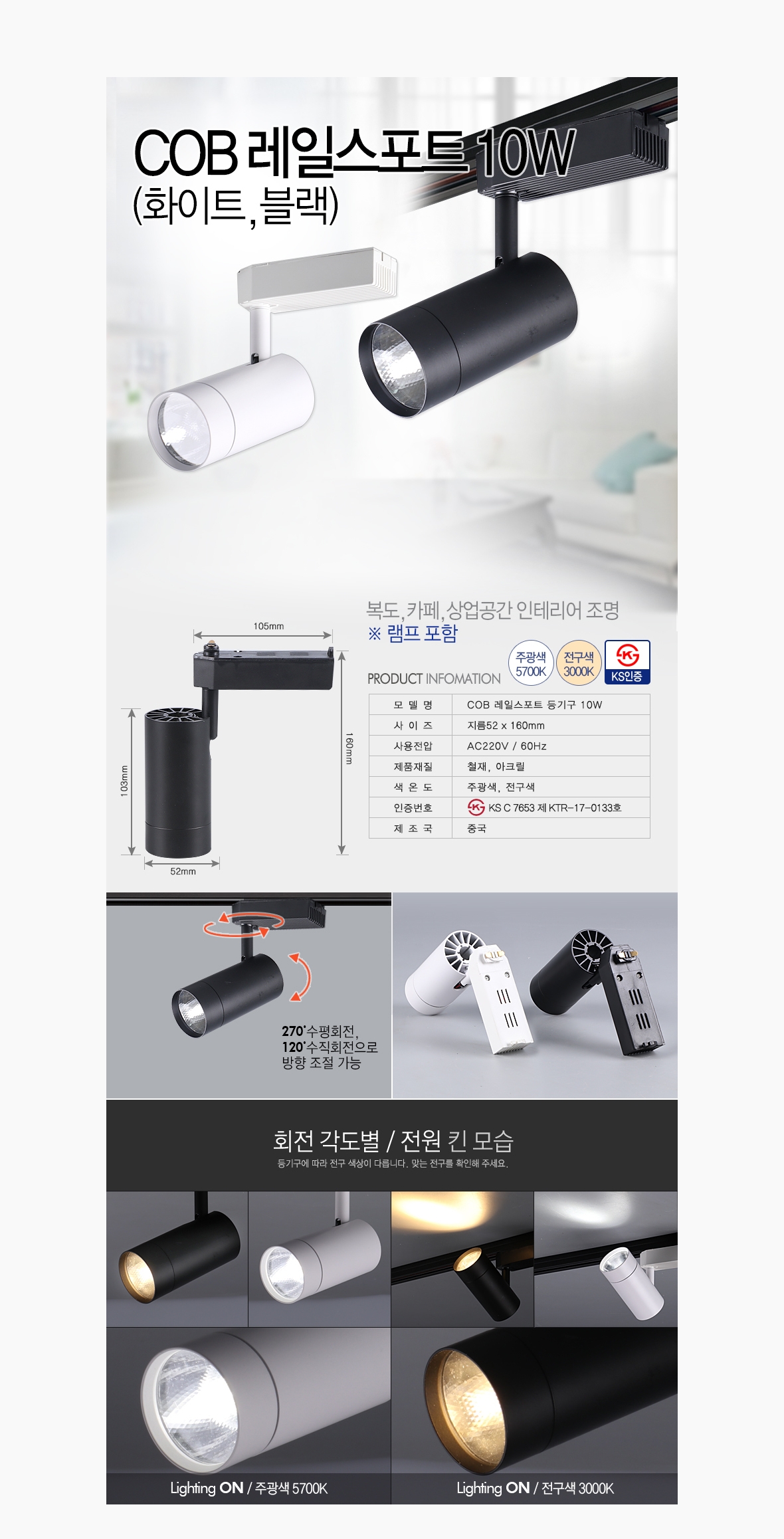 복도 카페 공간조명 COB 레일스포트 등기구 10W 2컬러