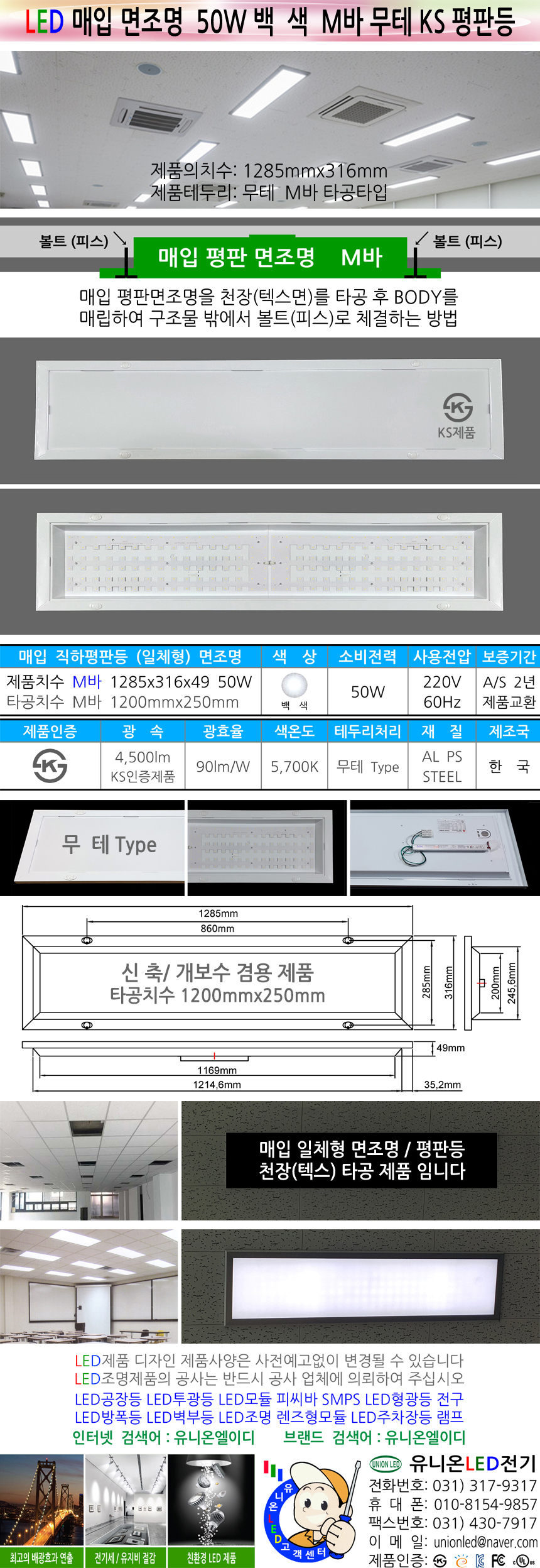 평판등 면조명 M바 무테 50W 백색 1285mm KS 매입등