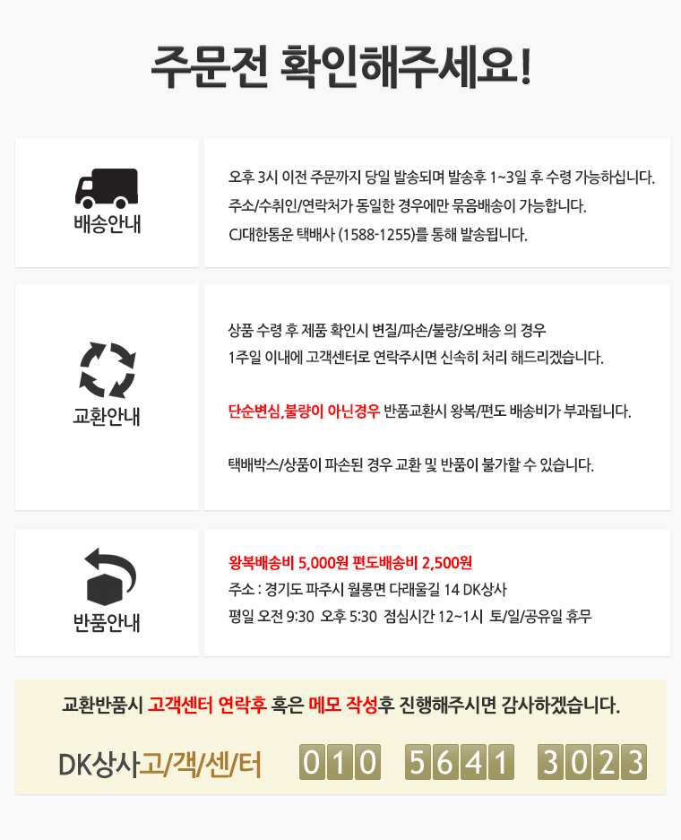 • 반품시 배송비전액+박스포장비1000원 구매자부담.통화없이 반품은 불가능합니다,