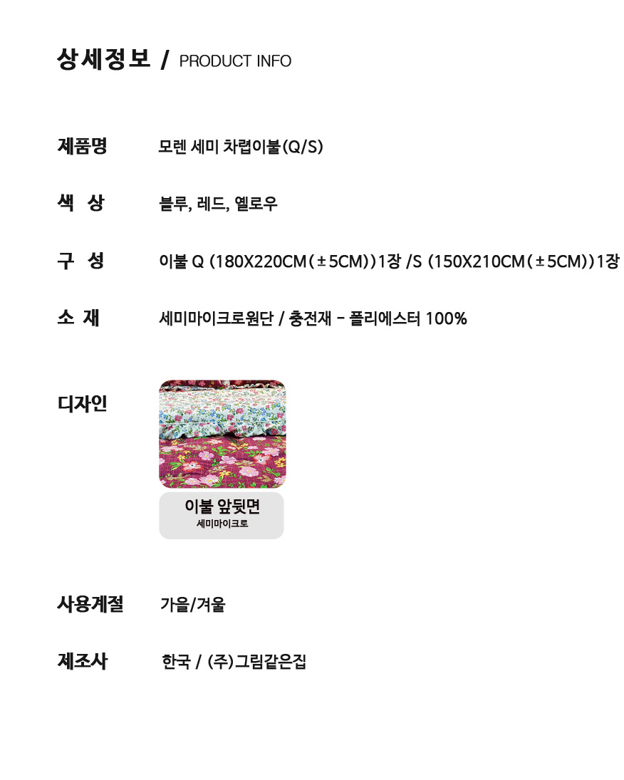 모델명 모렌 세미 차렵이불 Q/S