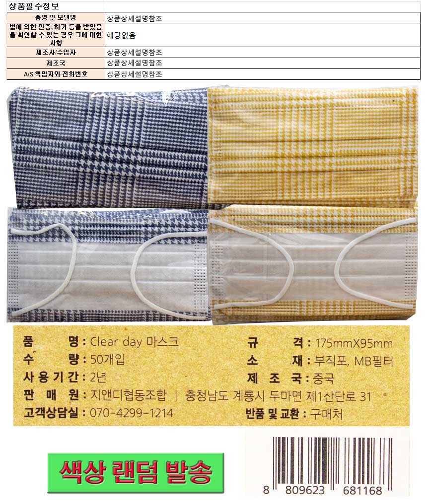 지앤디 클리어 데이 마스크 대형 50개입-색상랜덤 이미지/