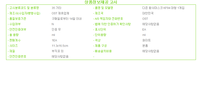 다존 황사마스크 KF94 대형 1개입 이미지/