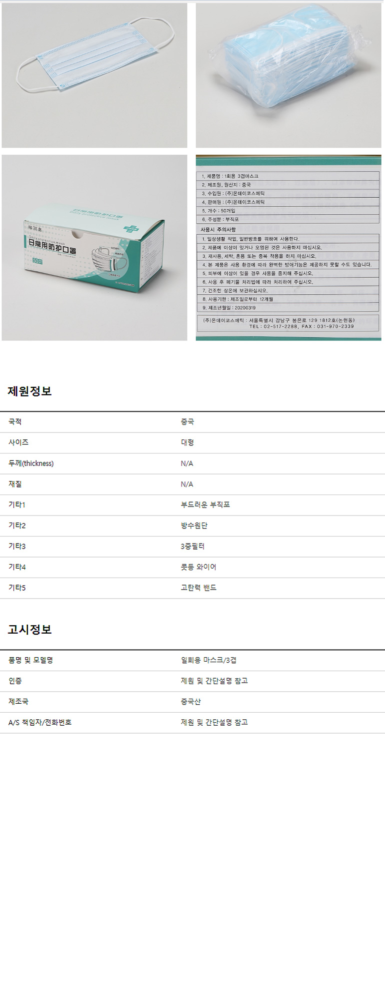 d09 일회용마스크보급형청색3겹(1각=50EA) 78300 이미지/