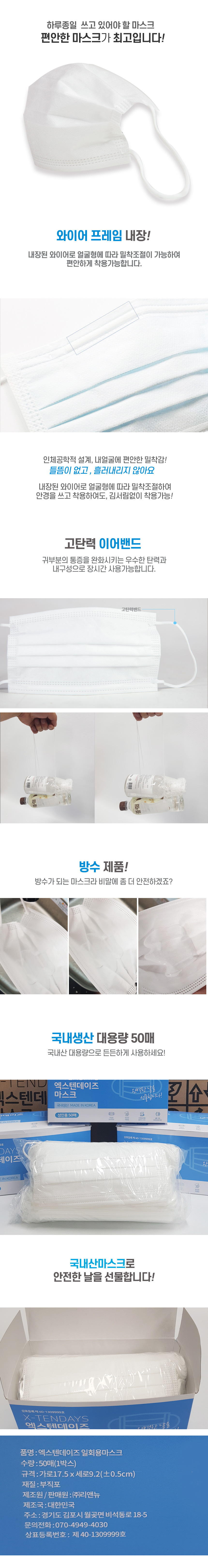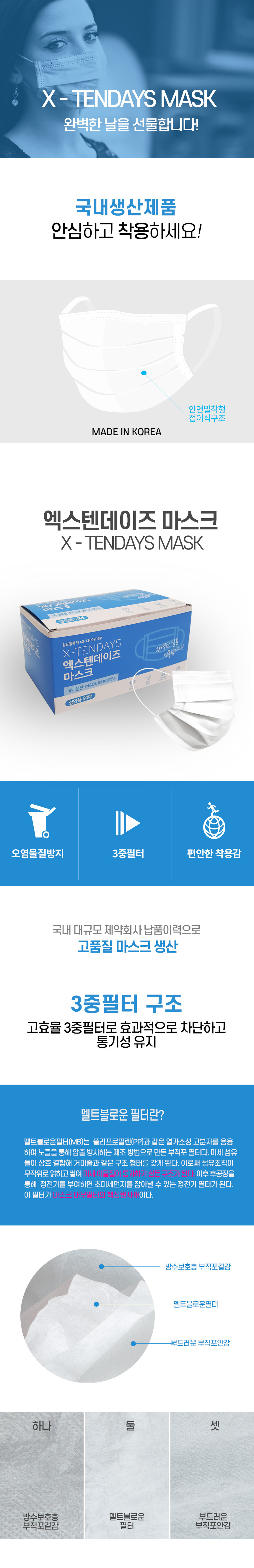 국내생산 엑스텐데이즈 3중필터 일회용 마스크 50매 이미지/