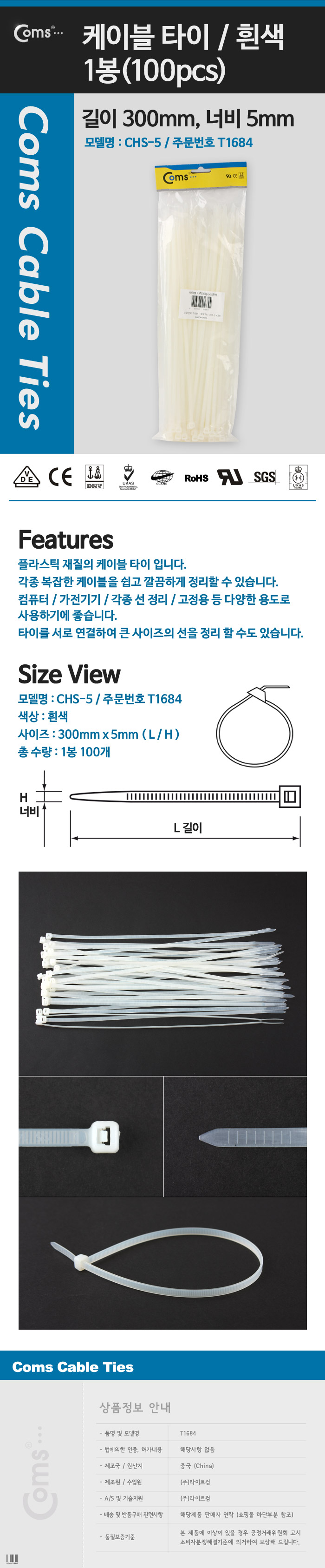 케이블 타이(100pcs) CHS-5 * 300/흰색 300mm x 5mm 이미지/