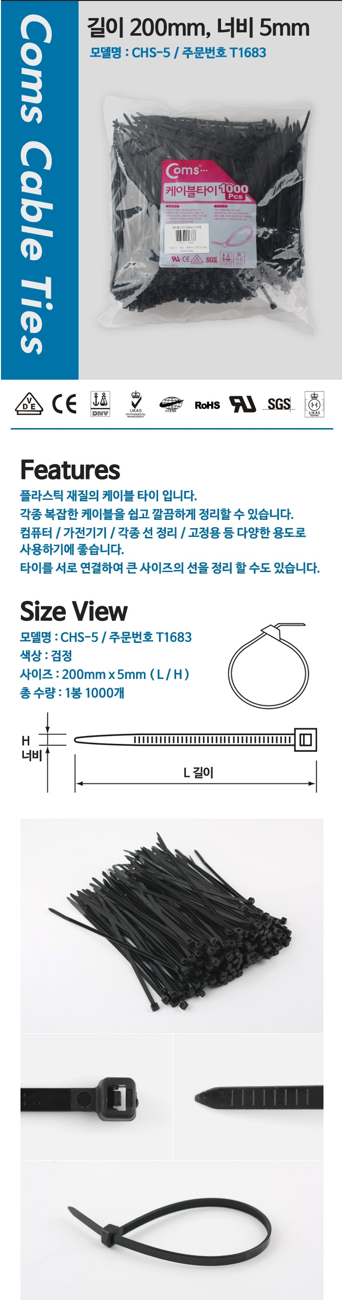 케이블 타이 200mm x 5mm 1봉/1000pcs 이미지/