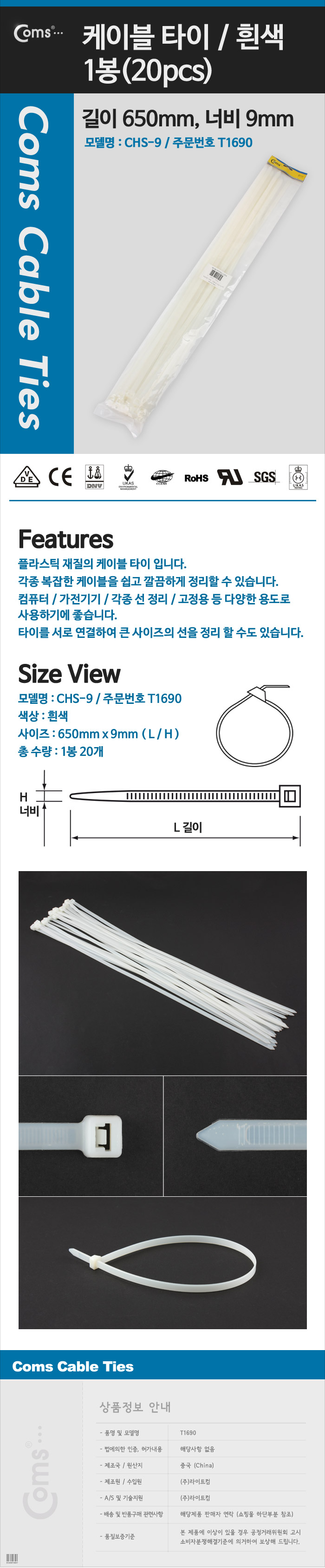 케이블타이 (20pcs) 흰색 CHS-9 650 650mm x 9mm 이미지/