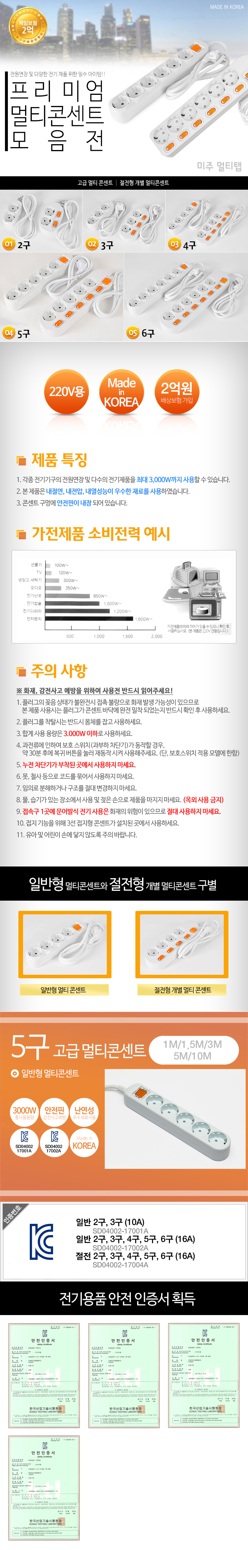 미주산업 국산 안전 멀티탭 콘센트 5구 1.5M (16A) 이미지/