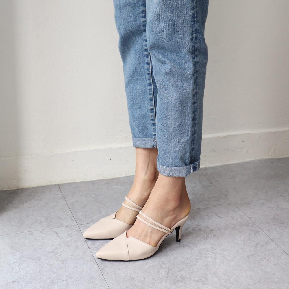 여성 소가죽 슬링백슬리퍼 반짝이 미들굽 5CM굽