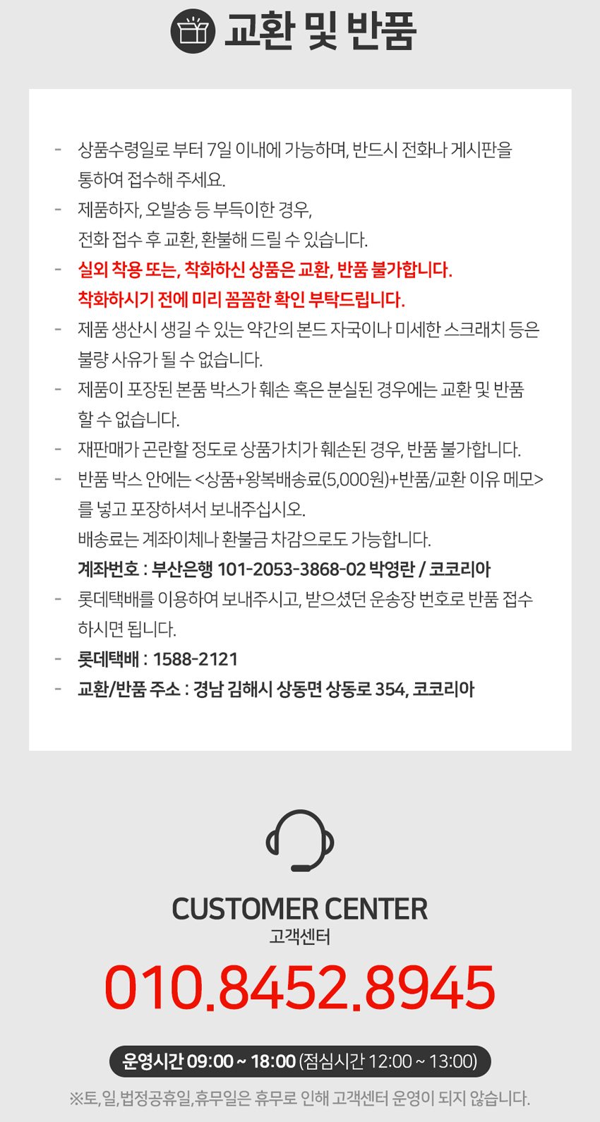 • 초기제품 이상의 경우 동일한 제품으로 1:1 교환원칙, 사용후 제품이상은 A/S를 원칙으로 합니다.