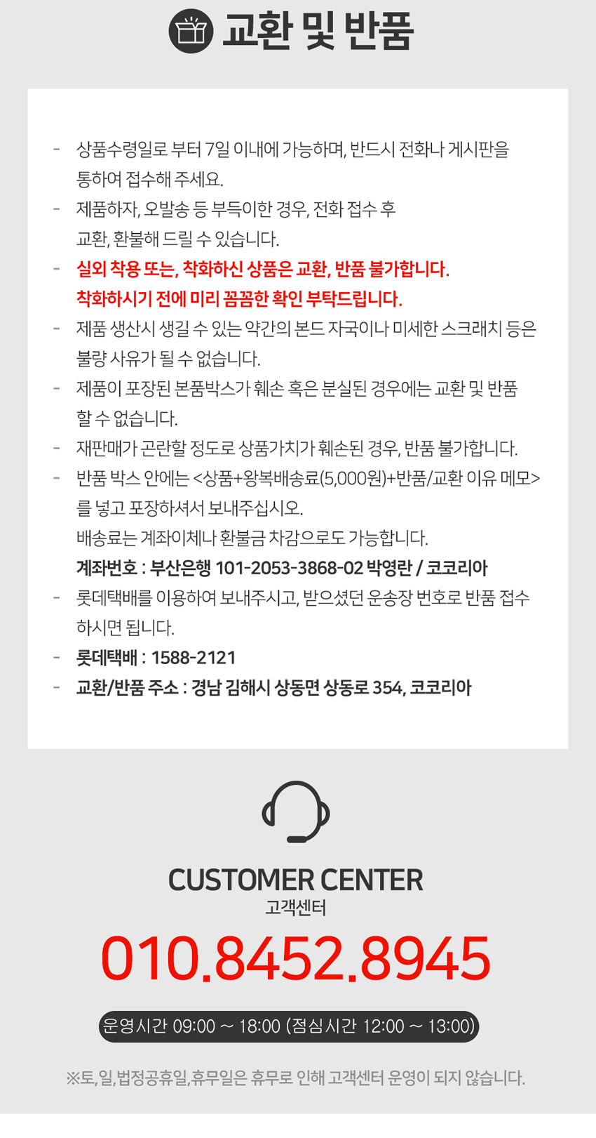 • 반품/환불조건: 도착후 1주일 이내 사용하지 않은 상태에서 가능합니다,초기제품 이상의 경우 동일한 제품으로 1:1 교환원칙, 사용후 제품이상은 A/S를 원칙으로 합니다,
