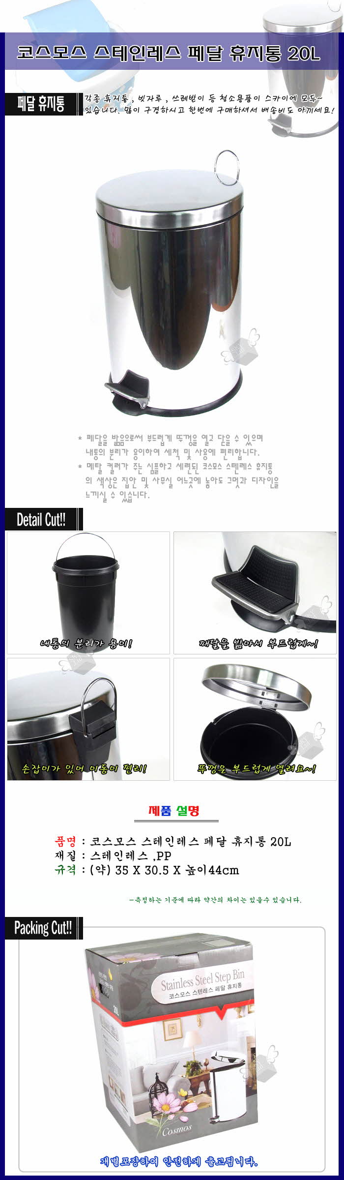 코스모스 스테인레스 페달 휴지통20L