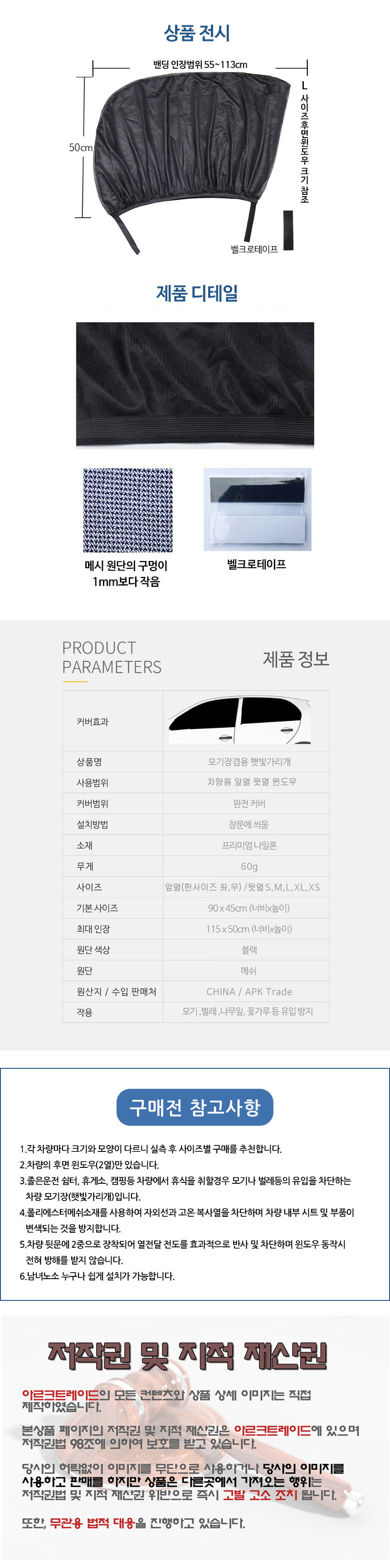 1. 품명 및 모델명 : 차량용 뒷좌석 모기장겸용 햇빛가리개