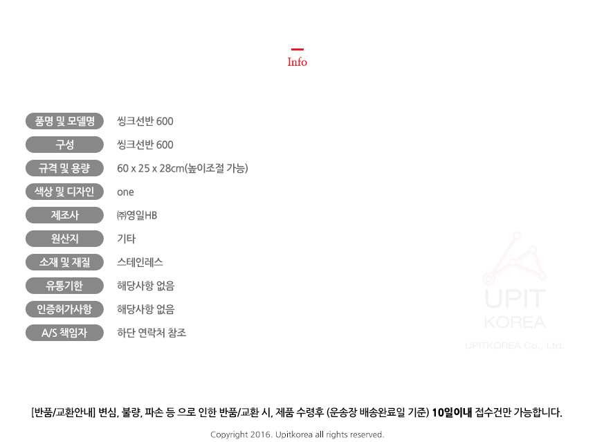 • 반품/환불조건: 도착후 1주일 이내 사용하지 않은 상태에서 가능합니다,초기제품 이상의 경우 동일한 제품으로 1:1 교환원칙, 사용후 제품이상은 A/S를 원칙으로 합니다,