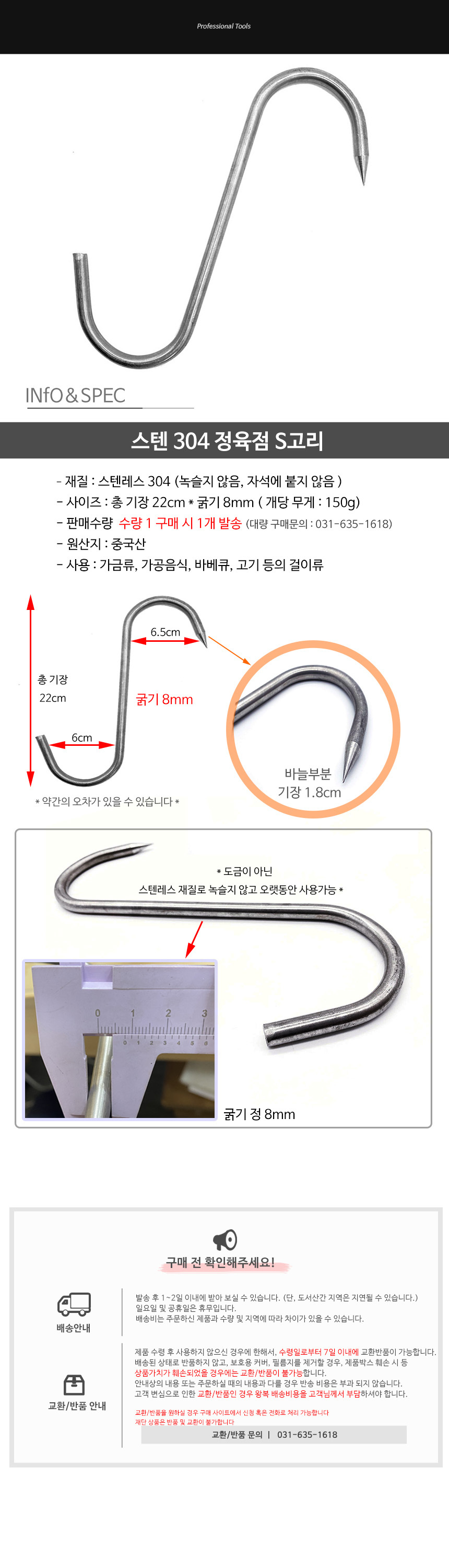 스텐 정육고리 S자 정육점 육가공 고기걸이 22cm 스텐레스 대형 S고리