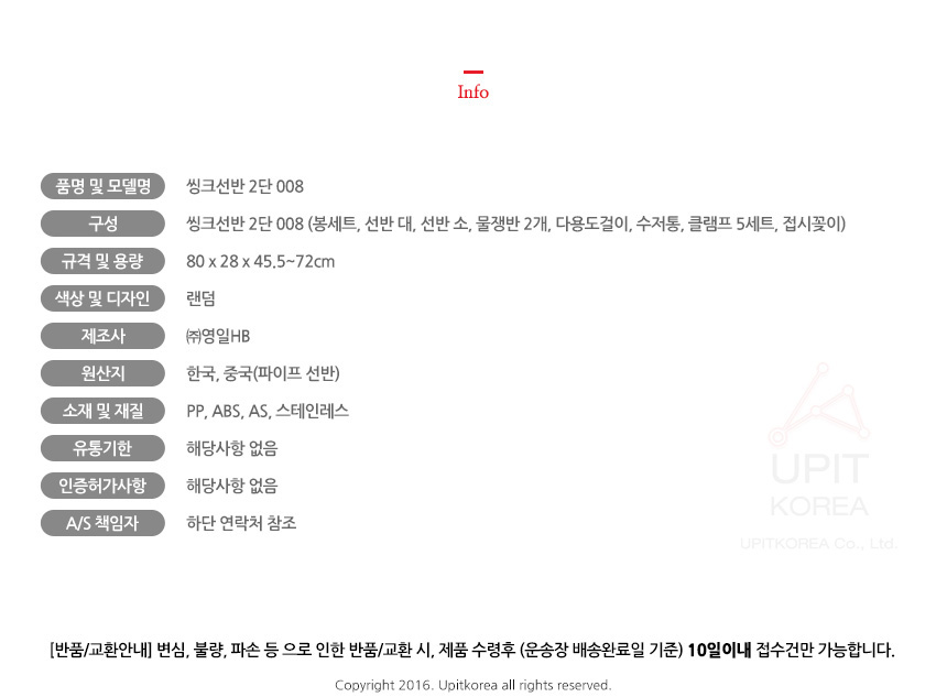 • 반품/환불조건: 도착후 1주일 이내 사용하지 않은 상태에서 가능합니다,초기제품 이상의 경우 동일한 제품으로 1:1 교환원칙, 사용후 제품이상은 A/S를 원칙으로 합니다,
