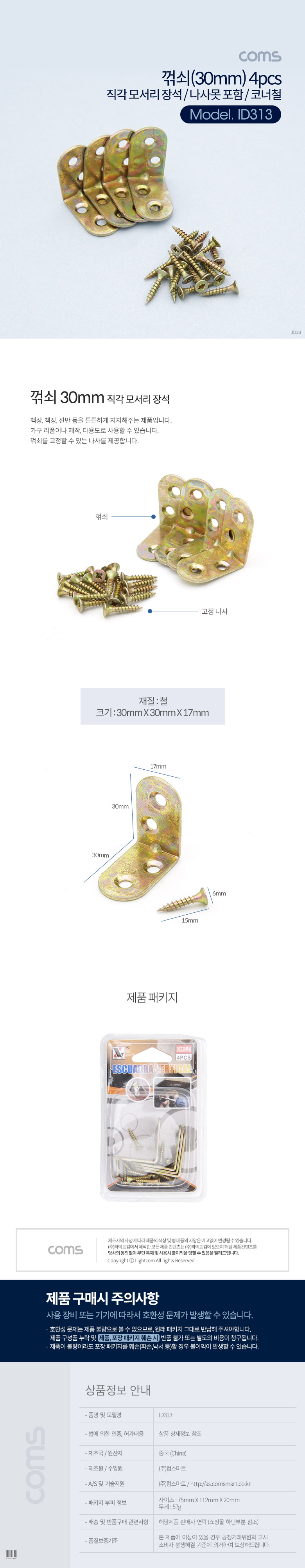Coms ㄱ자 꺽쇠 4pcs 30mm 직각 모서리 장석 나사못 포함 코너철 다보 보강철물  이미지/