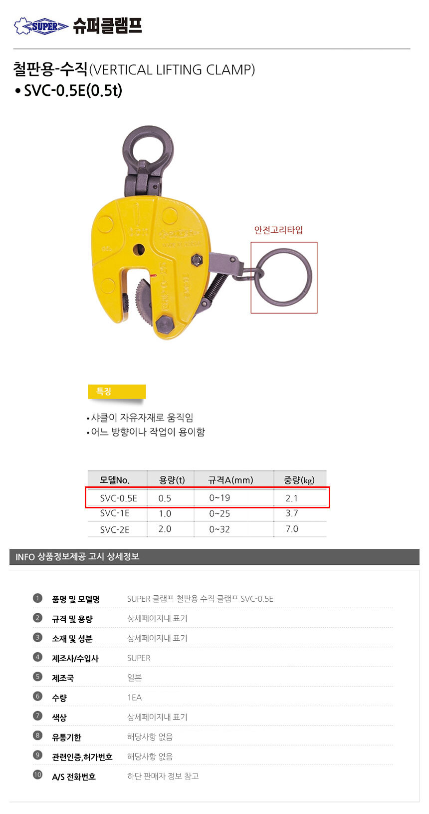 SUPER 클램프 철판 수직형 SVC-0.5E 안전고리